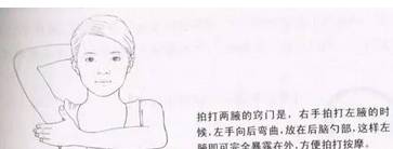 拍打两腋的敲门时,右手拍打左腋的时候,左手向后弯曲,放在后脑勺部,这样左腋即可完全暴露在外,方便拍打按摩。那么左手拍打右腋时,方向颠倒即可。